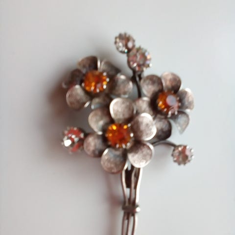 Elegant gammel broche. Gyldent metal, filgrand og tynde tråde sam to indfattede facetslebne lilla sten. Ingen stempler men lige til et bal på slottet ! Måler 4x3 cm. Lidt misfarvning på metallet bagpå men eller flot.