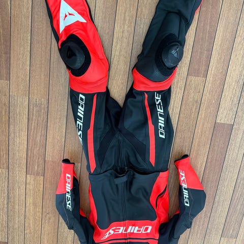 Super dragt fra den dyreste serie hos Dainese i det lækreste læder. Dragten kan lynes fra hinanden, så den kan bruges som jakke på varme dage. Læderet er perforeret og der er ventilations og strækzoner for maksimal komfort i en sportslig dragt. Yderligere er der en ventilations lomme i hver side, som kan åbnes hvis det er rigtig varmt. Der er hård beskyttelse i knæ/skinneben, albuer/underarme og skuldre samt absorptionspuder i bryst, ryg og ved hoften. Desuden titaniumsskaller på skuldrene, som giver lavfriktionsområder så man ikke slynges rundt i tilfælde af styrt. Der er speedhump for optimum aerodynamik og velcro på knæ til sliders hvis man er til banekørsel. Dobbelt lynlås i benet, så man både kan have dem indeni og udenpå støvlerne.