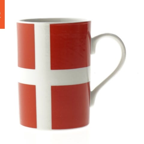 Keramikkrus i stærke røde og hvide farver med Dannebrog-motiv og teksten “Denmark” indvendigt. Perfekt som souvenir, til morgenkaffen eller til pynt i sommerhuset.