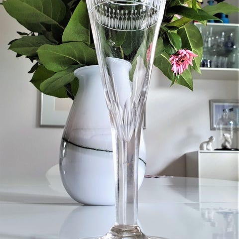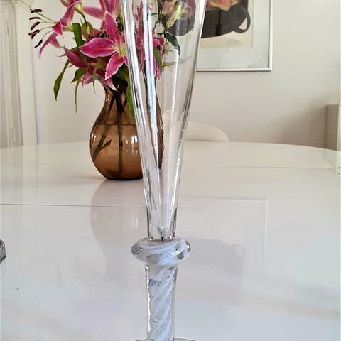 Stilk med knap og fine indlagte hvide og røde spiraler og stor fod.