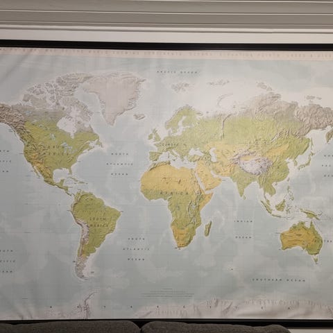 FLOT STORT VERDENSKORT, LAMINERET OG VASKBART. 136 X 87 CM.