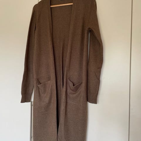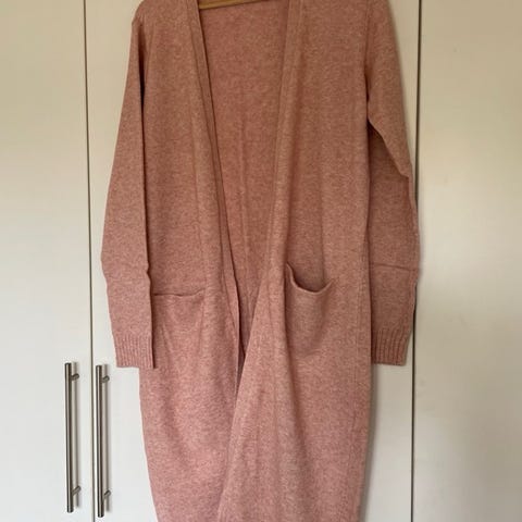 Lang sort strikcardigan med små lommer i siderne. 80% akryl/20% nylon.