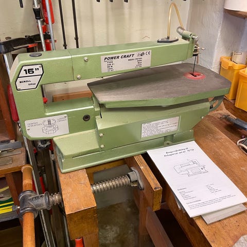 Har denne lille bundsolide dekupørsav i høj kvalitet. Meget velholdt. Man skal selv montere en lille motor eller evt en skruemaskine. Der medfølger en kilrem til den. God til finer og model arbejde.