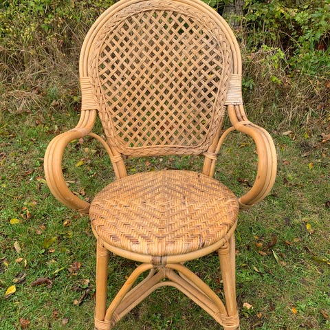 Denne havestol er fremstillet i sort flet og egner sig godt til udendørs brug. Stolen har et klassisk design med armlæn, der giver ekstra komfort. Materialet er vejrbestandigt, hvilket gør den ideel til haven eller terrassen. Pris 75 kr. pr. stk. vi har 2 stk. til salg.