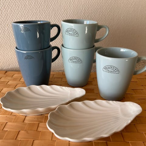 Fine, hvide serveringsskåle formet som muslingeskaller og med perle- og bladdekoration.