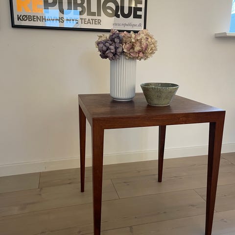 Severin Hansen Jr., sidebord, tegnet for Haslev Møbelsnedkeri, 1960'erne. Lakeret palisander og top med ilagte Baca fajancekakler tegnet af Nils Thorsson for Royal Copenhagen. Opsat på tilspidsede ben. H. 50, B. 58,5, D. 35,5 cm. Under bund nummereret 163 og med Den kgl. Porcelænsfabriks brændemærke.