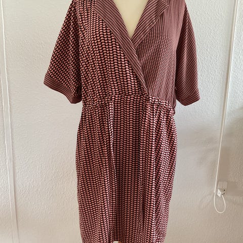 100% viskose. Rummelig med et brystmål på 98cm. Kjolen er vasket, men er helt ny og ubrugt.