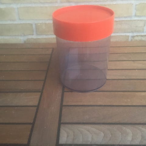 Gennemsigtigt plast med rødt skruelåg. Låget er postkasse-rødt (ikke som billedet viser).