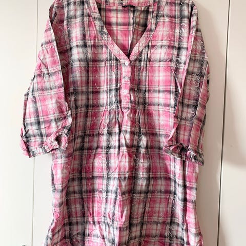 Smuk tunika fra Ze-Ze i en blålilla nuance og let, krøllet chiffon. Løs og luftig model med korte ærmer med rynkeeffekt og rund hals med lille flæsekant. Behagelig og feminin – perfekt til både sommerbrug og som strandkjole.