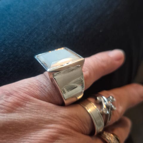 2. Signetring 925 sølv (ukendt mærke) bredde fra 3-12mm, tykkelse 1,5-3mm. Ringstr. 59 (indv. diam. 19mm), vægt 6,9 gram. 200kr