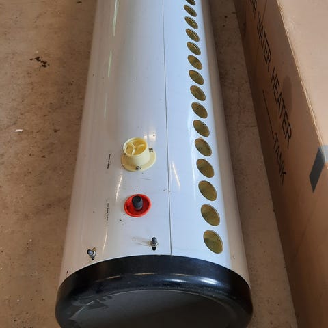 Standard vacuumrør 1800 x57mm, er monteret som solpanel i luftvarmesystem, der er 15 rør i alt. Rørene har ikke de indvendige kobberrør til varmt vand, men et sort stålrør. Systemet har fungeret fint i en del år og har opvarmet luften i kælderen, men er nu erstattet af en varmepumpe og en krydsvarmeveksler. De to 12V blæsere i fordeleren kører nu efter mange år ustabilt. Hele systemet eller kun rørene sælges, prisen er den samme, jeg afmonterer.