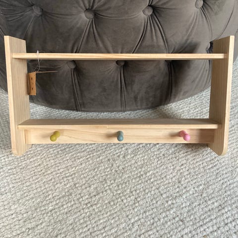 80 cm bred cremefarvet 25 cm dyb hylde der er 4 knager og den er samlet 35 cm høj.