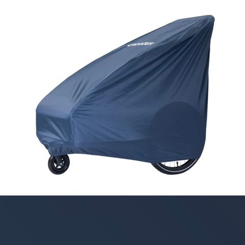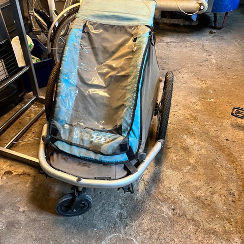 Der medfølger forhjul til løbevogn, og et lille drejbart forhjul til gåvogn, samt en arm til cykelanhænger (beslag til cykel medfølger også).