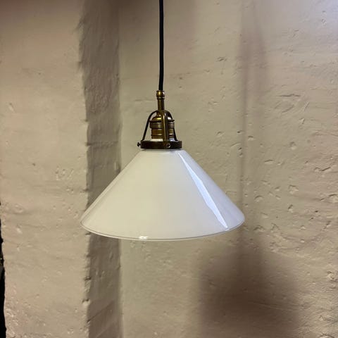 Pendel, Skomagerlampe, Gammel lampe fra ca 1920. Grønlakeret skærm og hvid emalje. Porcelænfatning d: 19 cm. Kan sendes efter aftale