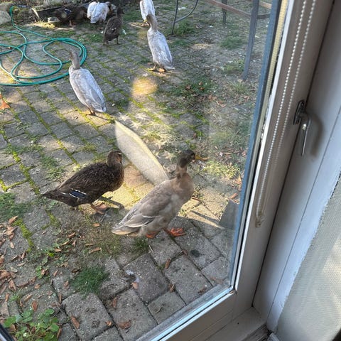 3 flotte løbeænder som er udruget den 1/6-25. Der er en brun hun (med hvide aftegn), grå/hvid/brun hun og en grå/hvid han