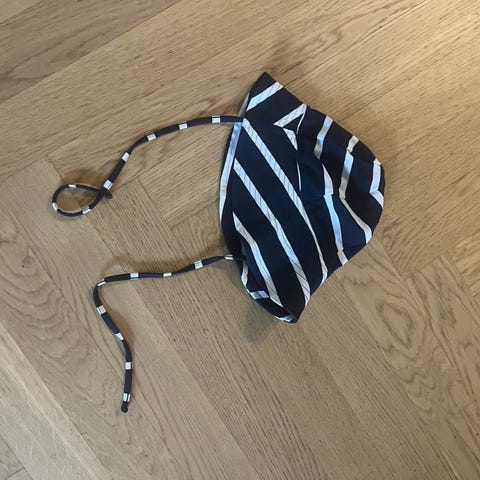 Vi sælger en badehat fra Hust & Claire i rosa med et alloverprint af ferskner i orange, røde og grønne nuancer. Størrelsen er 45-47 cm eller 9 måneder. Brugt i en sæson (sidste sommer).
