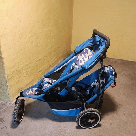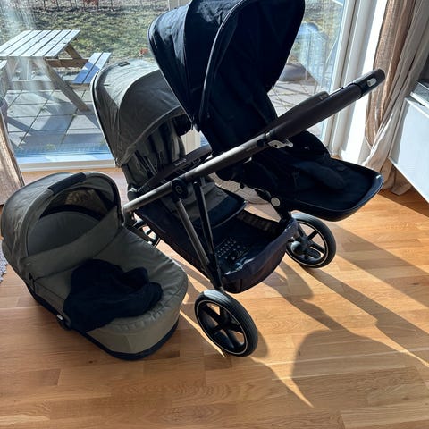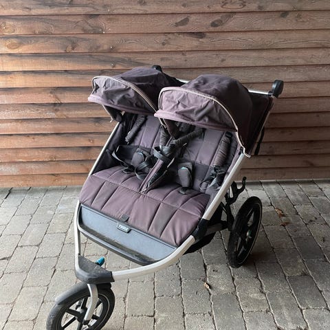 🚼 Vognen er brugt, men i god og funktionel stand. Perfekt til både hverdagsbrug og aktive ture med to små.