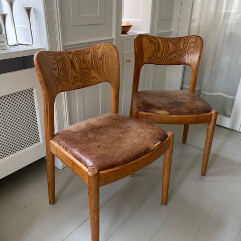 Den ene stol skal skilles ad og limes igen. Selve træet er fint, skal have en kærlig hånd og de står som nye..læder sæde knapt brugt.