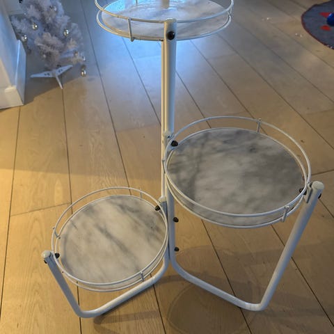 Fint lille træ af snoede metaltråde i bronzefarve. På træets grene hænger der prismer. Træet står på en bund af rødligt marmor.