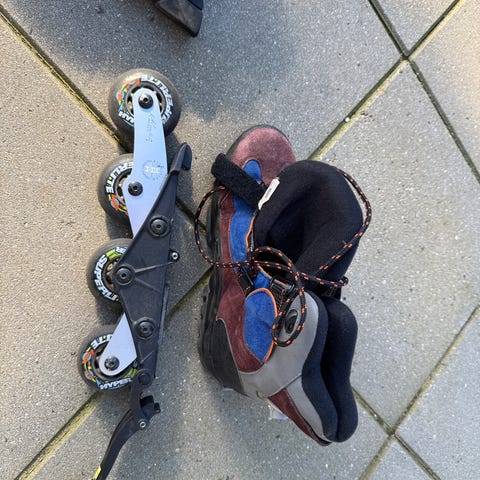 Lækre rulleskøjter i retro look med side-by-side hjul. Som dengang mor var ung. Lyseblå med gule snørrebånd. Størrelsen er 40-41. Ny-pris 1400 kr. For rulleskøjterne alene.