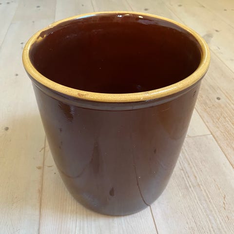 Ældre, men stadig med mærket på. 5 liter, 22,5 cm høj, 19 cm i diameter. Brun, selvfølgelig 😊