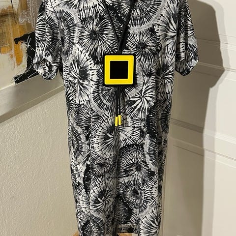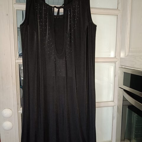 Flot design. Mange smarte detaljer. Har V hals og kjolen er uden ærmer. Falder flot. God kvalitet. Kan give sig.