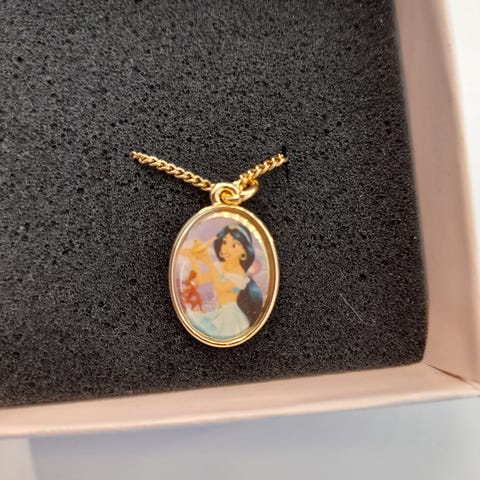 Sød Tornerose-halskæde fra Disney. Perfekt til små prinsesser eller Disney-samlere. I god stand. Der er forskellige vedhæng til. Kat, hest og prinsesse.