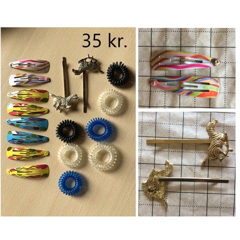 Samling af hårklemmer, hårspænder, hårklips og hårelastikker.