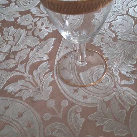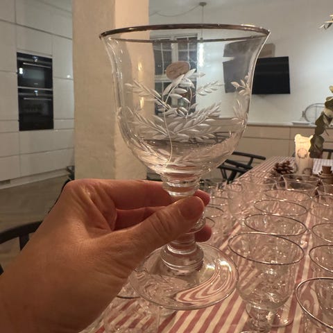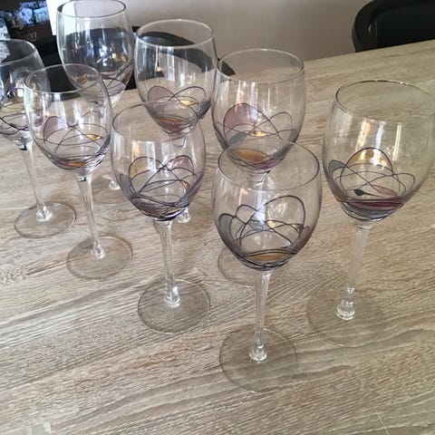 Fremstår flotte, men selvfølgelig brugte, faktisk er flere af rødvinsglassene og vandglassene helt ubrugte.