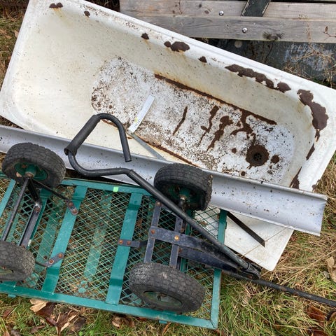 Opbevaringskontæner en foderautomater og en malet fjørnebænk med ryglæn. Gives væk.