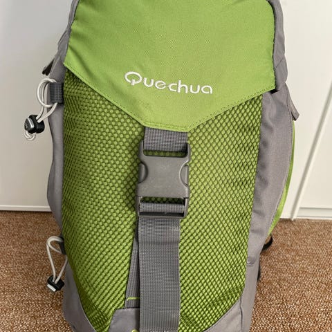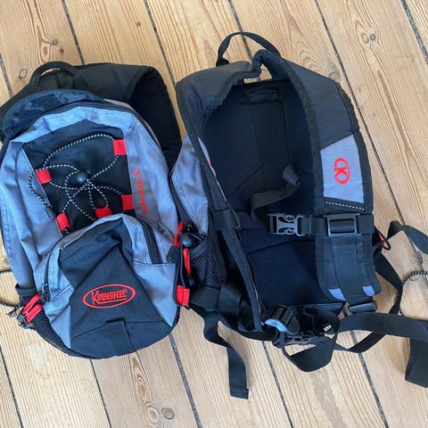 Fin lille rygsæk der sammenfoldet fylder meget lidt. Har ét stort rum og én mindre lomme. Det grå stof nederst er en smule solbleget, men ellers er rygsækken i fin stand.