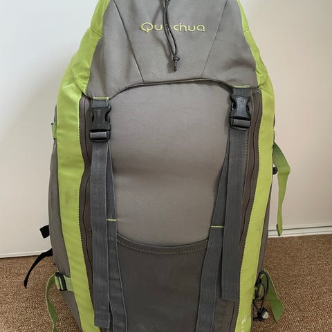 Fin lille rygsæk der sammenfoldet fylder meget lidt. Har ét stort rum og en mindre lomme. Det grå stof nederst er en smule solbleget, men ellers er rygsækken i fin stand.