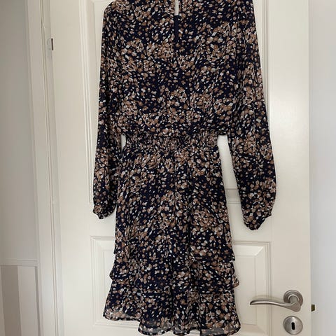 Flot lillablomstret kjole med 3/4 ærmer og flæsedetaljer på brystet. Dobbeltlagts, så den ikke er gennemsigtig. Yderlag: 100% bomuld/ Inderlag: 100% polyester. Fra AWARE-kollektionen.
