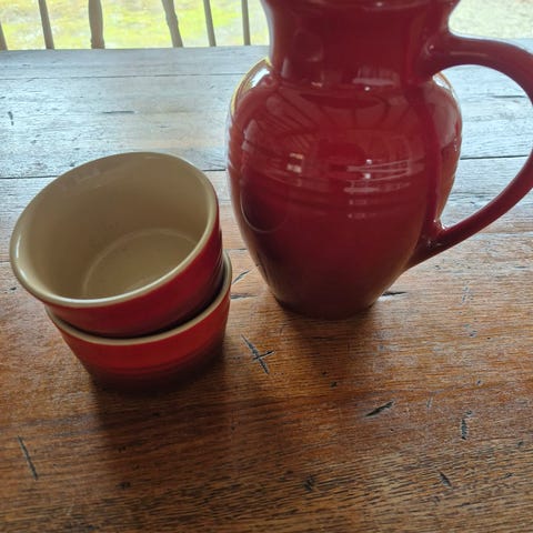 Le Creuset skål i røde toner. I fin stand. H. 9. L. 26. D. 21 cm. I perfekt stand
