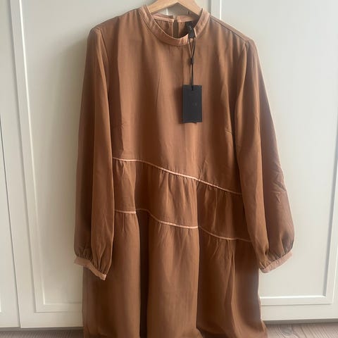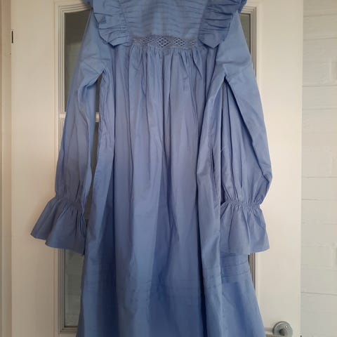 Superflot lilla midi-kjole med lilla blomsterprint. 2/3 lange ærmer med elastikkant forneden, der giver let poset effekt. knaplukning foran øverst. Flæsekant nederst. 100% viskose. Brugt få gange, så er som ny.