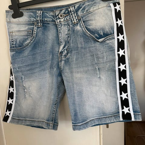 Italienske denim jeans shorts i S med rødt og hvidt kantbånd ned langs siderne.