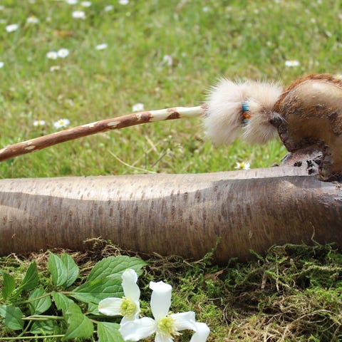 Rasle lavet af rådyr skind, med mink hoved pels, en muslingeskal, en sodalit krystal for enden, håndtaget er lavet af drivtømmer fra stranden.🐾❤️