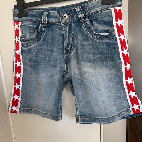 Denim / Jeans shorts i S med sort og hvidt kant bånd langs siderne samt trash detaljer.