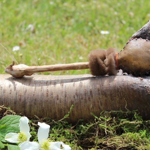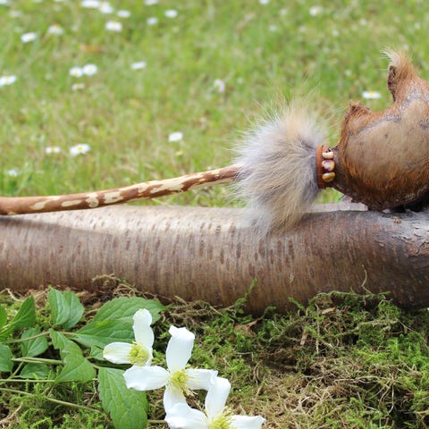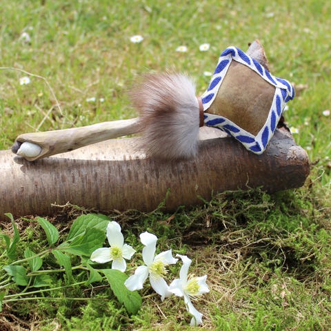 Rasle lavet af rådyr skind, med ræve pels, små krystaller og rav(apatit), en bjergkrystal for enden, håndtaget er lavet af lærketræ. 🦊❤️