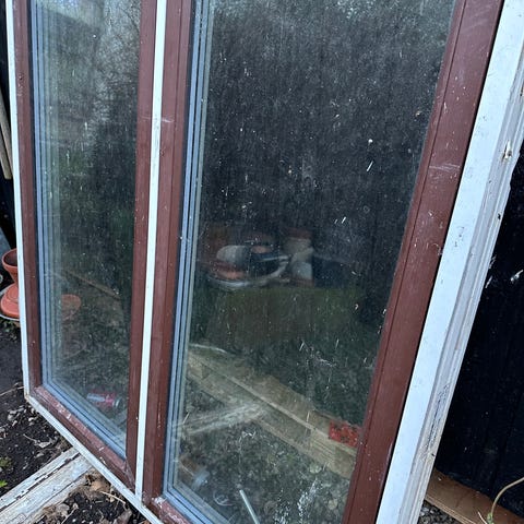Men træet (hvori ruden er indsat) har lidt råd i bunden - ikke selve rammen (se efter gult tape på billedet). Derfor er ruden i øvre højre hjørne løs.
