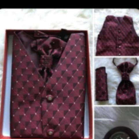 Fint sæt bestående af vest og bukser. Bukserne er blevet lagt op, (tjek billedet nr.9-10 ) så du kan få yderligere 3,5-4 cm. håndoplægning. Brugt en gang til barnedåb. Størrelsen svarer til 4-6 år børn.