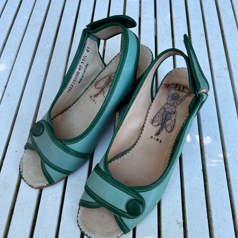 Fly London sandaler i to grønne farver i blødt skind med 7,5 cm kilehæl.