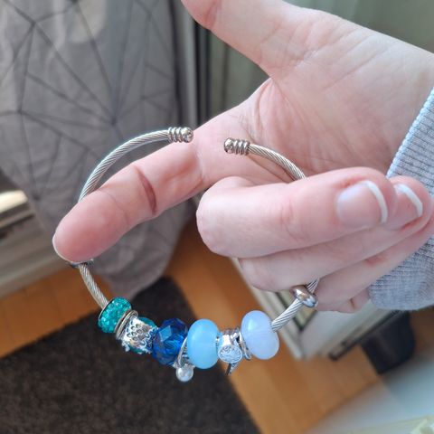 Sort armbånd med glimmer. Armbåndet måler ca 21,5 cm. Der er huller til flere størrelser mellem 15 - 19,5 cm ca.