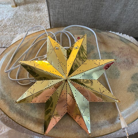 Den har lidt patina på spidserne, derfor den lave pris. Det kan nemt plettes med lidt hvid maling hvis man ikke kan leve med det. (Ses ikke i mørket.) Ledning og pære medfølger, så den er klar til at hænge op.
