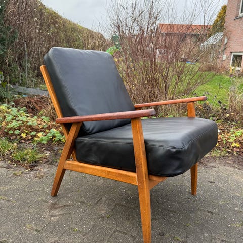 Den flotteste retro lænestol i teak og kunstlæder. Er købt på Lauritz.com og fungerer upåklageligt.