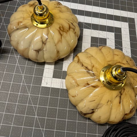 Et sæt vintage glaslampeskærme fra en Pie and Mash café i London.