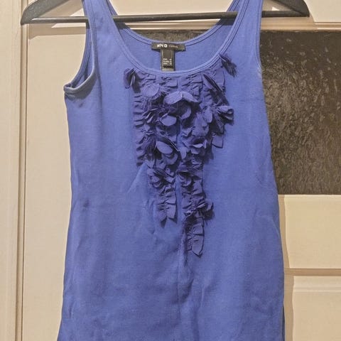 Top, Mango, str. 36, Lille sød top i blødt cowboy stof i str small. Blå med mørkeblå prikker. Mrk. Mango.