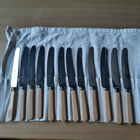 Knive m. Barkelit skaft 12 stk. Et skaft har en revne, se billede.