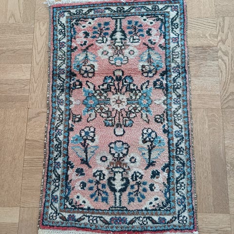 Støvet rosa tæppe kun lagt til pynt på en puf. Ligner uld men, er det ikke. Det er blødt.
