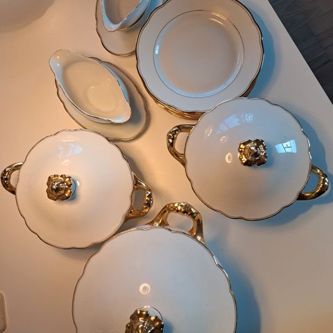 Porcelæn, 10 par kaffekopper, kagetallerkner, fade. Hvid med guldkant. Sættet indeholder tillige sukkerskål med låg, flødekande og et par små skåle. Stellet blev designet i forb. m. royalt bryllup i 1930'erne.